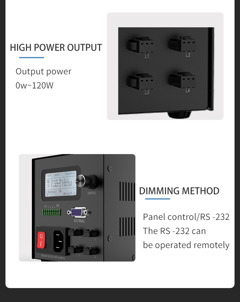● One controller can control four different LED light sourcesindependently.